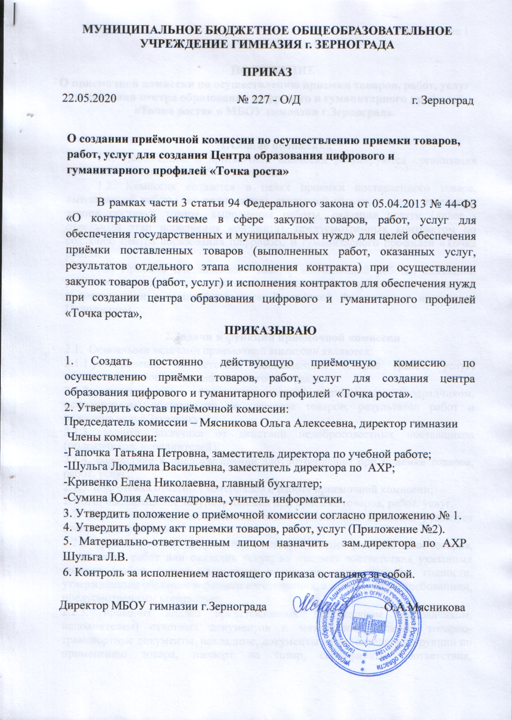 Приказ от 22.05.2020 №227 О создании приёмочной комиссии по осуществлению приемки товаров, работ, услуг для создания Центра образования цифрового и гуманитарного профилей Точка роста.bmp